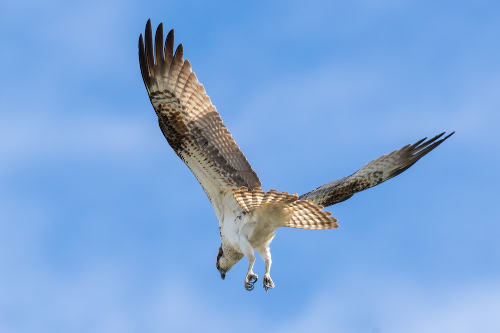 高い場所からホバリングしながら獲物を探し、水中に急降下して足で捕まえます。アジサシやカワセミのように嘴ではなく、足指の裏にある滑り止めを使ってしっかりと魚をつかむのが特徴です。